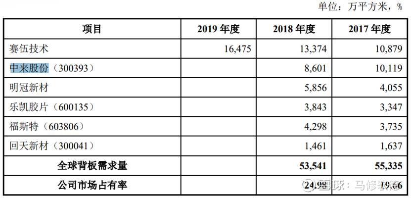 从事复合型背板的企业主要有本公司8、中来股份、中天光伏材料有限公司、 明冠新材料股份有限公司、乐凯胶片股份有限公司、广东圣帕新材料股份有限公 司、湖北回天胶业股份有限公司等,其中本公司 2018 年出货量约 23GW,连续 5 年保持世界领先地位9,中来股份出货量约 14GW,位列全球第二。