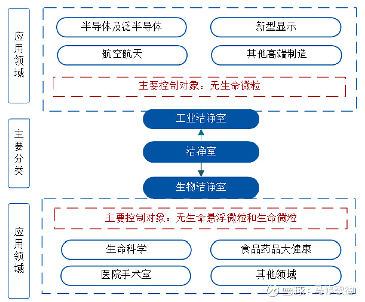 工业洁净室以无生命微粒为主要控制对象,主要应用领域包含半导体及泛半导体、新型显示、航空航天及其他高端制造业,对无生命微粒控制标准严格洁净度等级更高。生物洁净室以无生命悬浮微粒和微生物等生命微粒为主要控制对象,主要应用领域涵盖生命科学、食品药品大健康、医院手术室等领域,对于微生物等生命微粒控制标准更加严格。