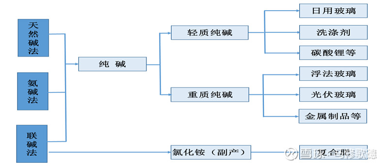 纯碱的生产方法主要有化学合成法和天然碱法两种,化学合成法主要包括氨碱法、联碱法。纯碱可分轻质纯碱和重质纯碱两种,两者主要差别是物理性能,如松散程度、颗粒 大小、形态等。纯碱产品分类及用途见下图: