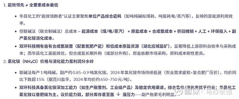 华昌化工和双环科技都是联碱法生产型企业,略微有些差别双环科技氯化铵部分用途在工业,而华昌化工则是农业——复合肥生产,这可能略微解释下两者在2024年联碱业务毛利率的区别!