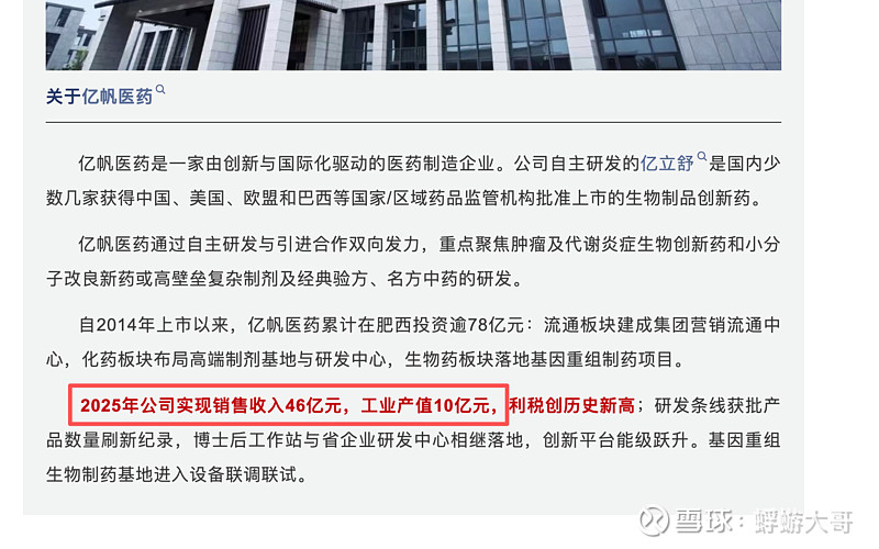 $亿帆医药(SZ002019)$ 肥西县官方公众号“肥西发布”有一篇文,介绍欣竹生物通过欧盟EU-QP审计,其中有行字,与我之前对亿帆的判断相一致。这行字是:“2025年公司实现销售收入46亿元,工业产值10亿元”。
