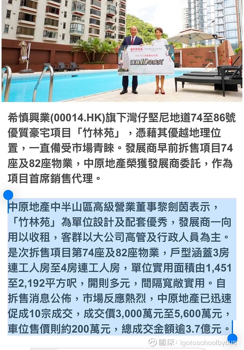 $希慎兴业(00014)$ 竹林苑,好像比林海山城好賣 10 宗成交錄得 3.7 億成交額 樓齡確實是比較舊,想不到也能賣出個好價錢,可能是跟地理位置有關吧,那個位置走下去合和中心,好像5分鐘不用竹林苑,2017 年曾經考慮過重建,但最後不了了之了屋宇署今年10月批出23份建築圖則,其中希慎位於半山堅尼地道74至86號的竹林苑獲批准於7層平台之上興建5幢32至36層分層住宅,涉及樓面面積約69.04萬方呎。