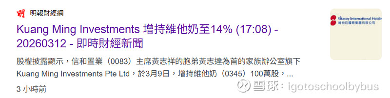 $维他奶国际(00345)$ 有時候也不知道他們打怎樣的算盤了 如果加上 Far East(楊協成)的持股,黃家的持股上升到 19.61%。