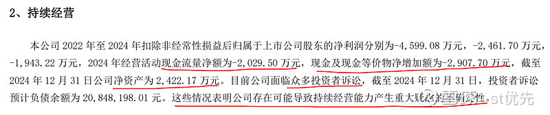 本公司 2022 年至 2024 年扣除非经常性损益后归属于上市公司股东的净利润分别为-4,599.08 万元,-2,461.70 万元, -1,943.22 万元,2024 年经营活动现金流量净额为-2,029.50 万元,现金及现金等价物净增加额为-2,907.70 万元,截至 2024 年 12 月 31 日公司净资产为 2,422.17 万元。目前公司面临众多投资者诉讼,截至 2024 年 12 月 31 日,投资者诉讼 预计负债余额为 20,848,198.01 元。这些情况表明公司存在可能导致持续经营能力产生重大疑虑的不确定性。