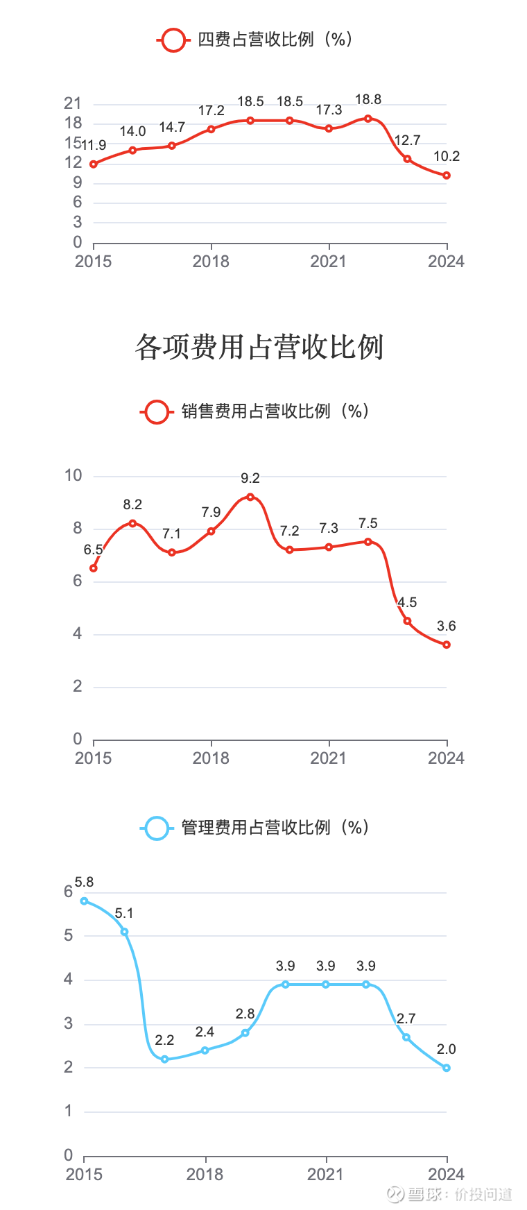 随着营收提升,“四费”占营收比大幅下降,从2022年的18.8 % 下降至2024年的10.2 %。