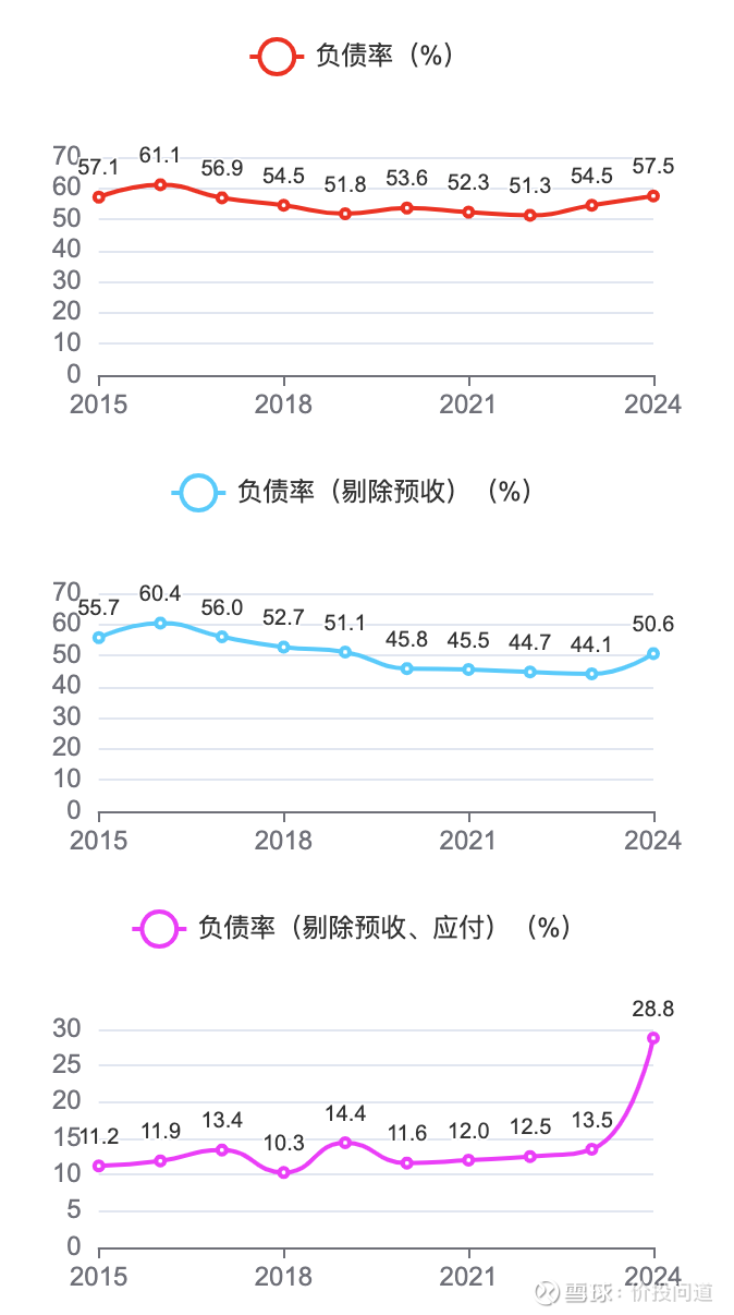 剔除预收、应付以后,2024年28.8 %。负债率降低了很多,说明有很多负债属于经营性负债。这表明公司对上下游的资金占用能力极强,是其产业链强势地位的体现。不过这个数值比往年12%左右的水平高了很多。