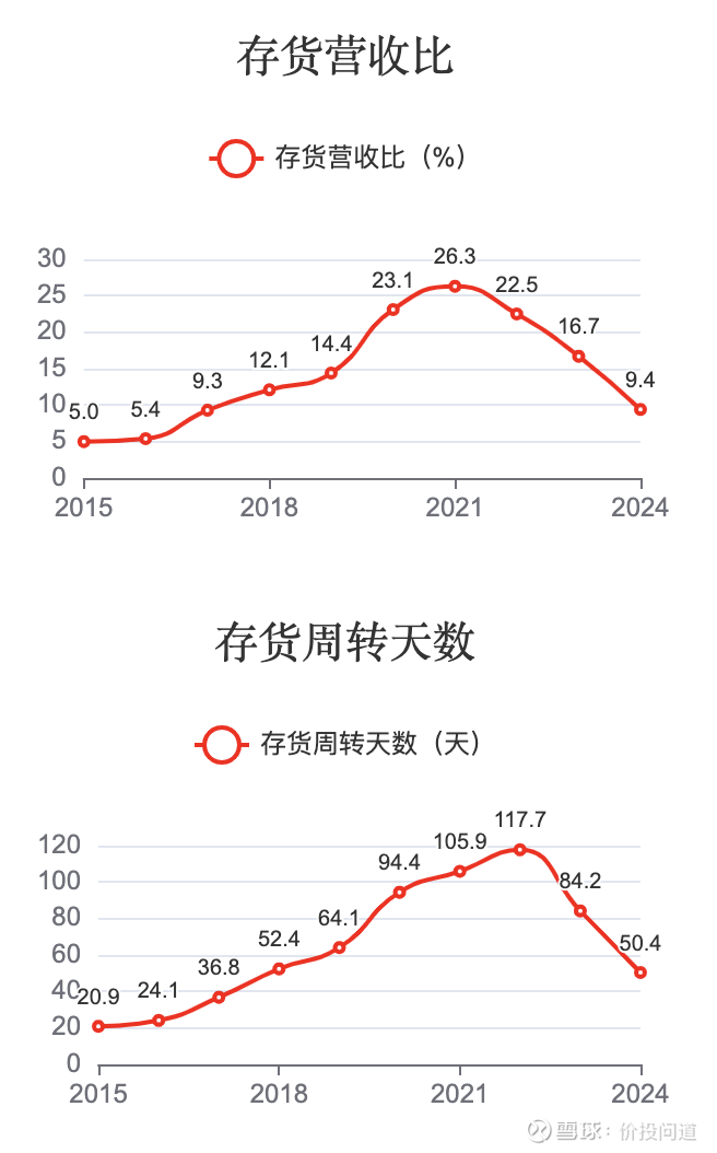 2021年存货营收比曾经达到过高峰26%,不过,存货占比近三年持续下降,2024年9.4 % 。还可以。