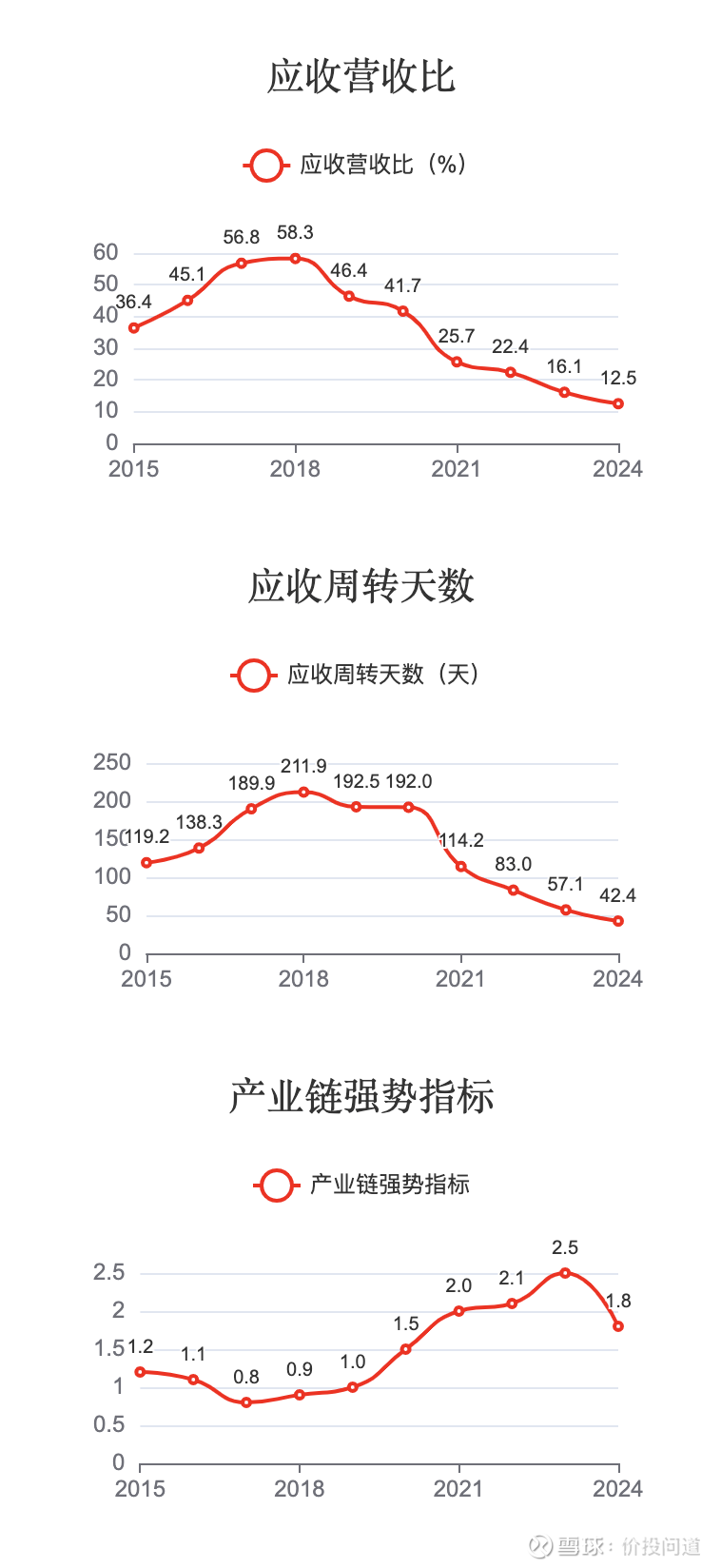 “产业链强势指标”多数年份大于1,在产业链上还算比较强势。曾经在应收很高的时期,该指标曾经小于1。