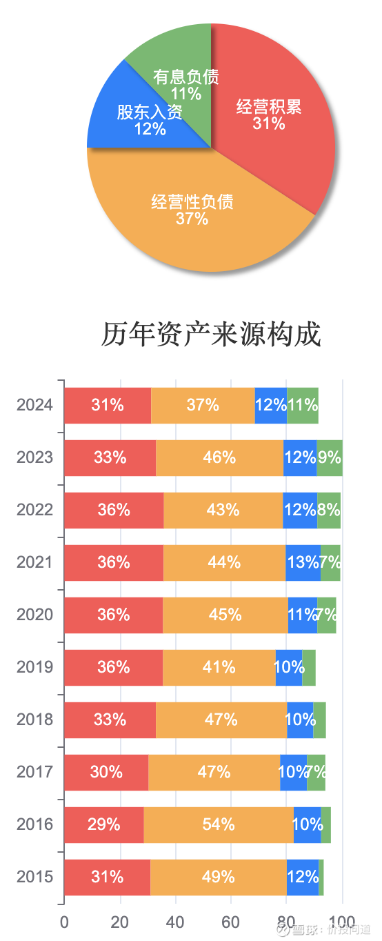 经营积累占比31%,这是公司历年净利润留存下来的部分,占比稳定在29%-36%之间,是资产的第二大来源。自身经营的利润积累也不错。