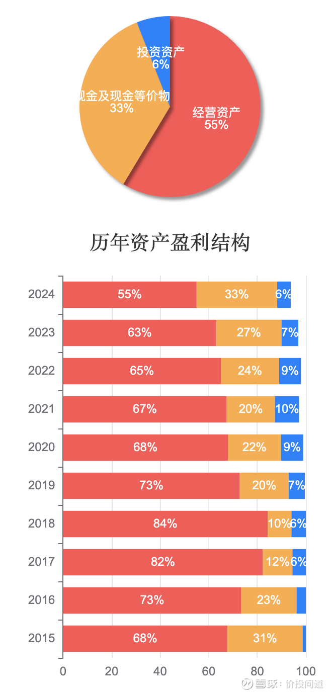资产盈利结构,经营资产最多,占比55%。其占比从2018年的84% 的高位持续下降至2024年的55%。同时,现金及现金等价物从10%增加到33%。已经超过了25%。