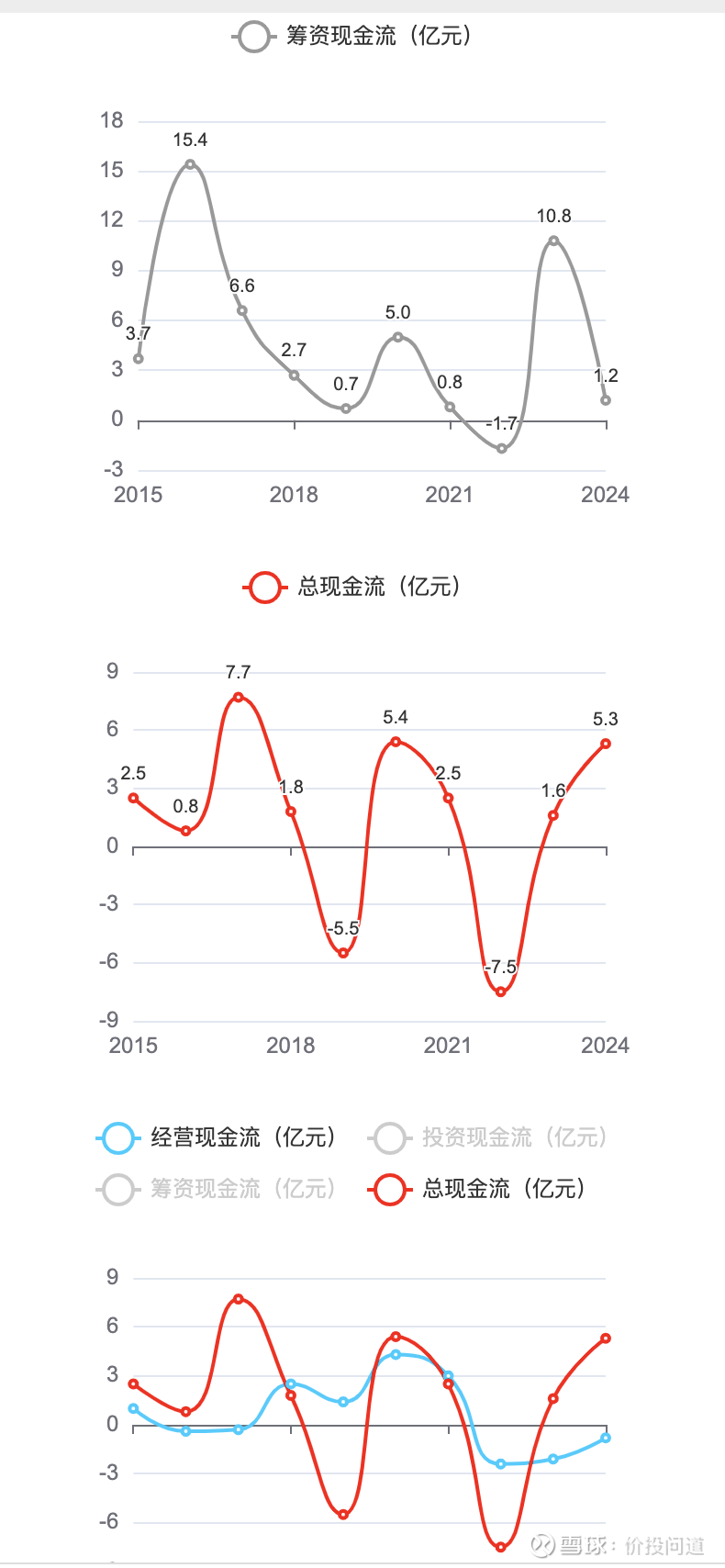 投资现金流多数年份为负数,说明企业还在投资发展阶段。2024年的大额转正主要是理财产品到期赎回导致的。2025年第三季度,资本支出仍占了经营现金流净额的41.58%,说明仍在投入。