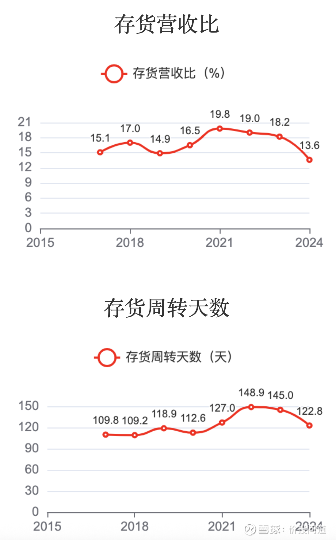 存货波动较大,2024年还是因为业务剥离的问题,导致营收异常低,对应的计算公式也就导致存货占比和周转天数都很高。我们还是看往年的平均水平。