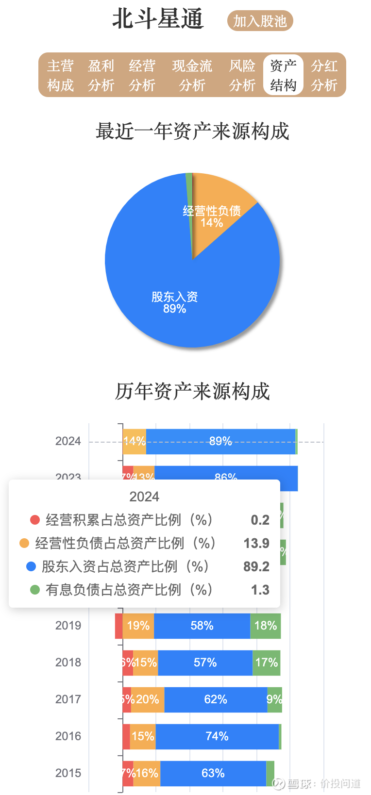 资产来源构成。经营积累占比很低,仅有0.2%。有息负债也不多,仅有1.3%。