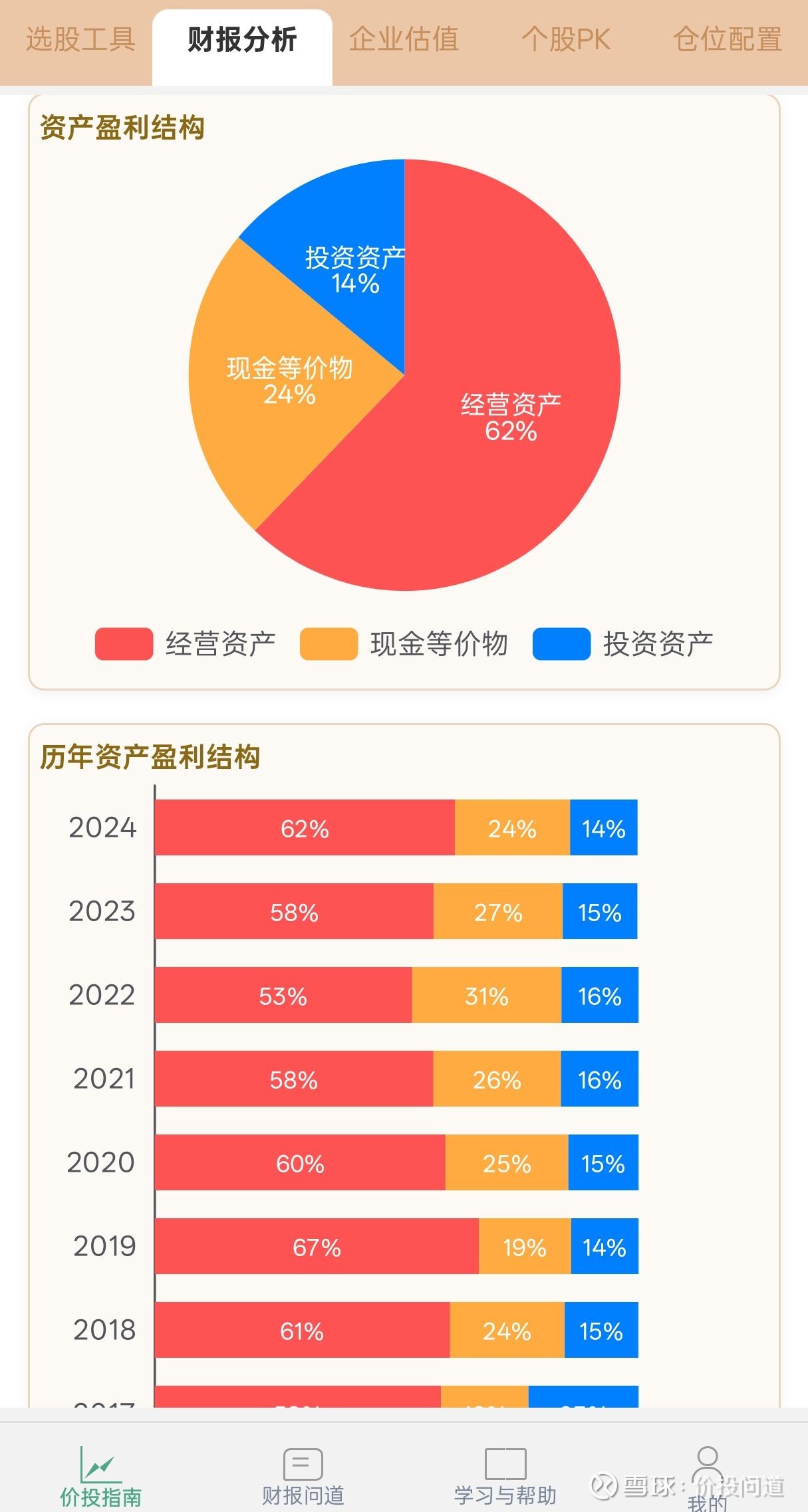 资产盈利结构以经营资产为主,占62%。不过现金及现金等价物占比24%也不算太低。且从趋势上来说,有一定周期性波动。