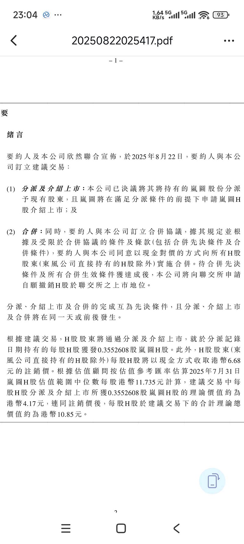 $XD东风科(SH600081)$ 8月22日,东风集团股份(0489.HK)发布公告称,子公司岚图汽车将以介绍上市方式登陆港股,东风集团股份(0489.HK)将同步完成私有化退市。