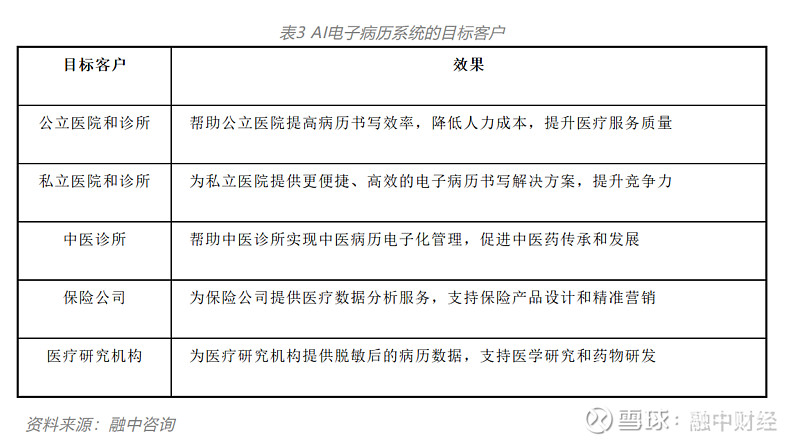 AI电子病历系统的目标客户主要有公立/私立医院和诊所、中医诊所、保险公司、医疗研究机构等。