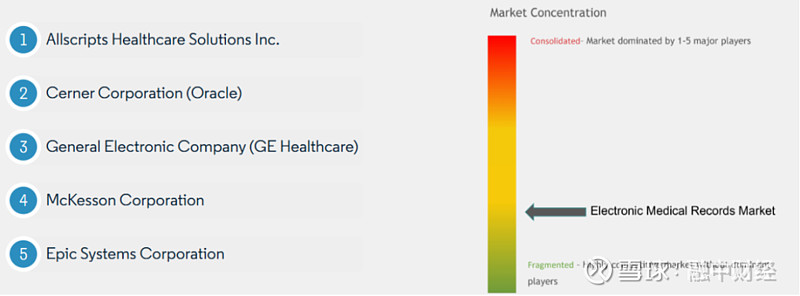 全球电子病历市场分散且竞争激烈,有多家国际参与者,集中度不高。主要参与者正在采取不同的增长战略来增强其市场占有率,包括Epic Systems Corporation、Cerner Corporation (Oracle)、Allscripts Healthcare Solutions Inc.、eClinicalWorks等,其中Epic是美国市场主要的领导者,在美国EMR市场占据较大份额。
