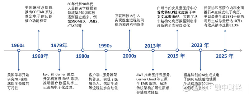 从60年代学界开始研究NLP技术在临床医学领域的可行性,到如今AI生成式电子病历系统在三级医院落地应用,EMR技术与医疗NLP技术经历半个世纪的发展,融合成为如今的智能AI电子病历系统。