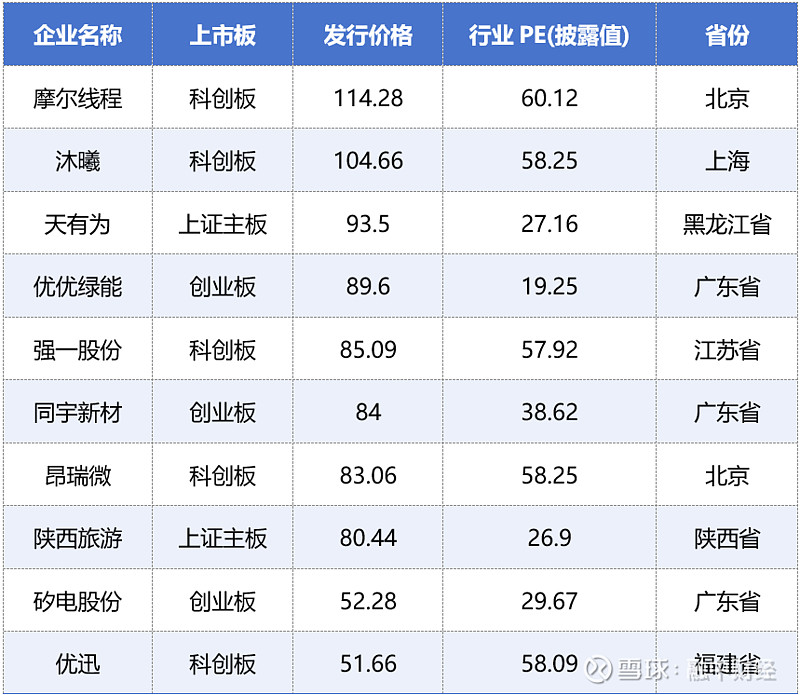 Wind数据显示,摩尔线程、沐曦股份、天有为、优优绿能等十家企业凭借高发行价跻身前列。