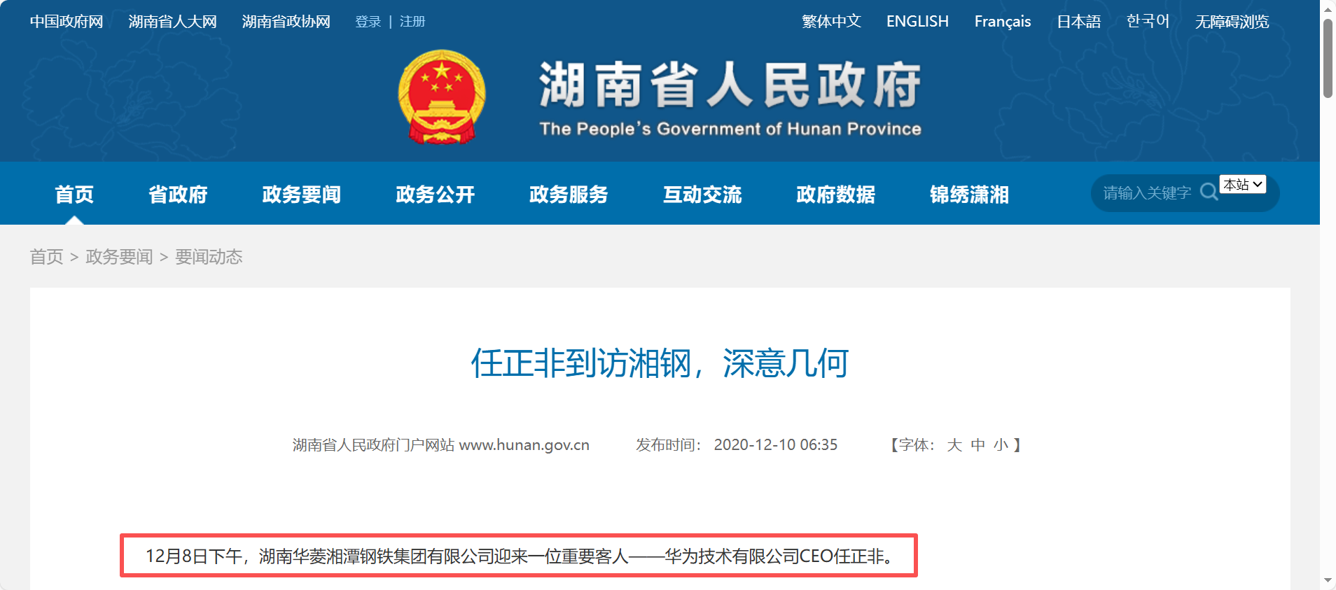 五年前的2020年,也是12月10日(这也是华菱线缆本次启动的时间节点,不得不说,冥冥之中,自有天注定了),湖南省人民政府网站【政务要闻】板块,发布了题为《任正非到访湘钢,深意几何》的动态,详细介绍了时任华为技术有限公司CEO的任正非任总到访华菱线缆的控股股东、湖南华菱湘潭钢铁集团的消息。多家重量级媒体也及时跟进做了详细报道。
