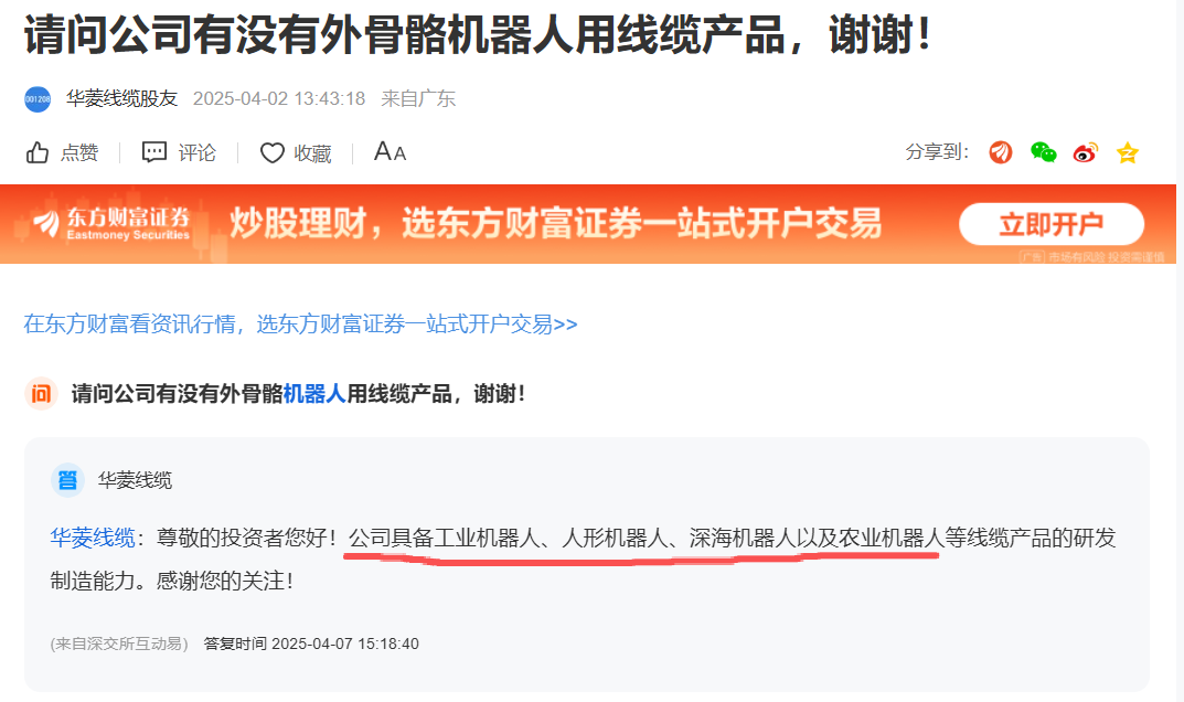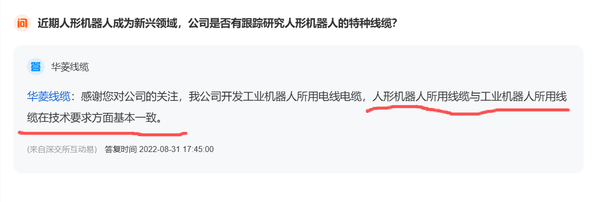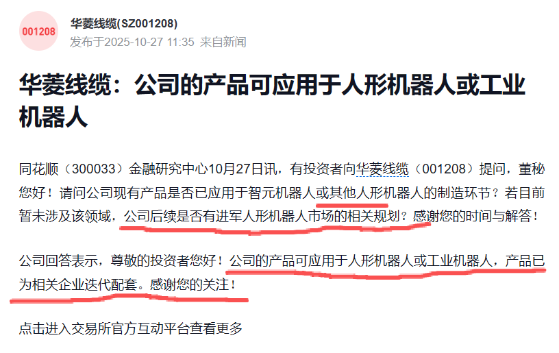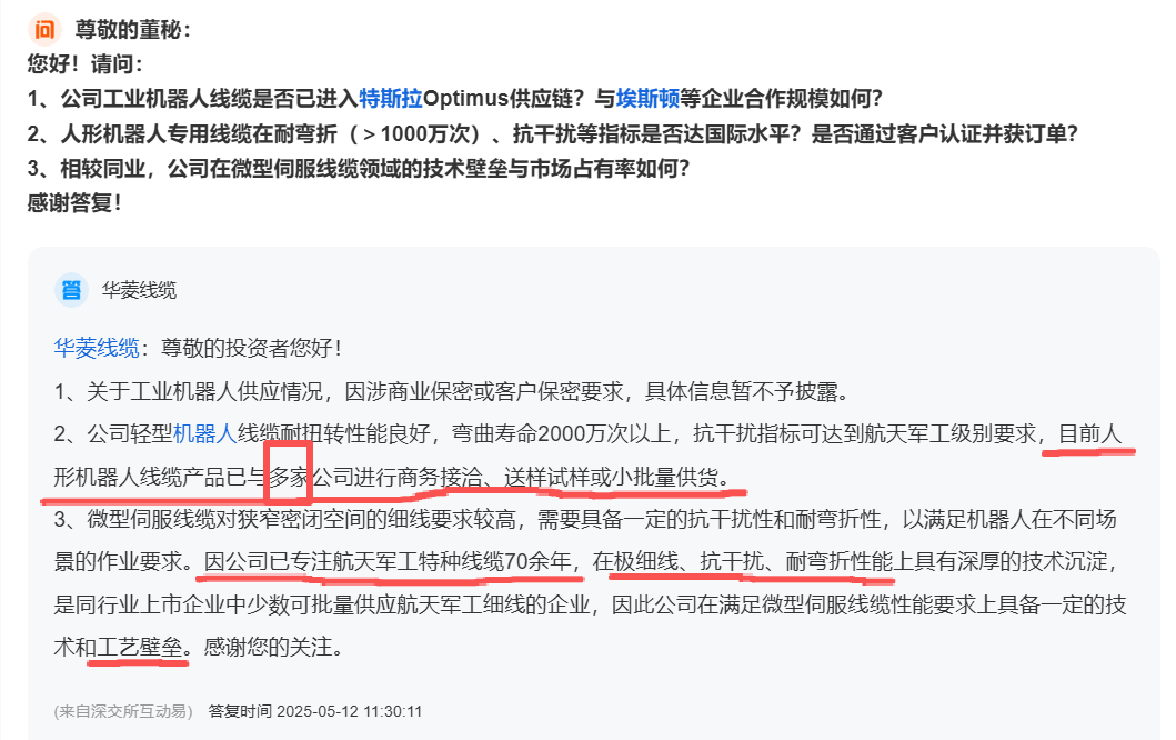 若真如此,结合华菱线缆于12月9日发布的投资者调研交流记录,以其多次在董秘问答中所提及的人形机器人领域“相关客户”,似乎呼之欲出了。