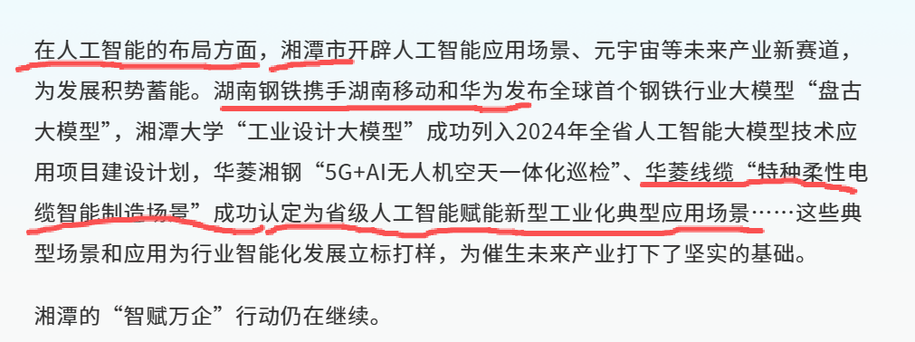 此后,华菱湘钢与华为公司不断催生产业成果,例如智能点检系统、5G+智慧天车远程操控、智慧机械臂 5G观感互动 、5G+超高清全景VR 、无人驾驶天车远程5G超高清视频回传等应用场景的陆续落地,并于2023年成功联合研发全球首个面向钢铁行业的AI大模型。