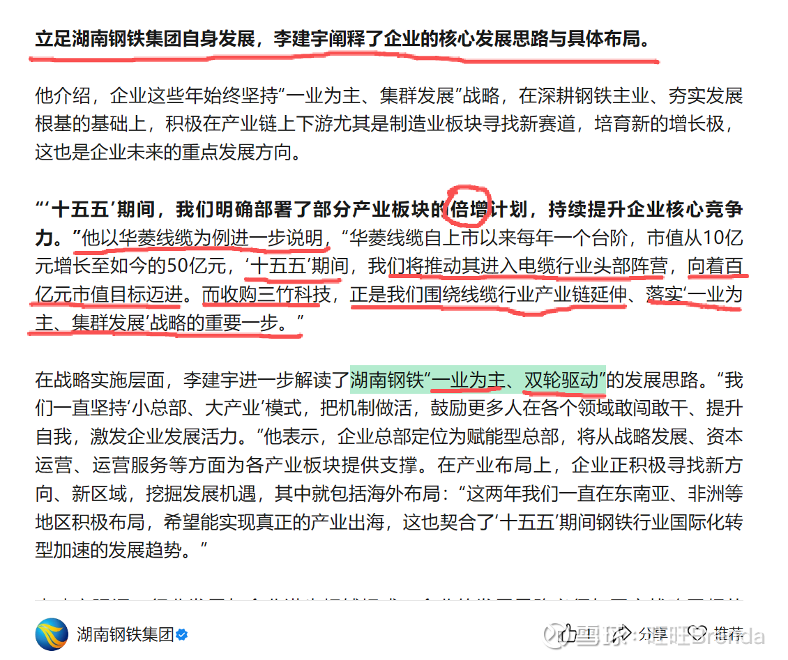 大佬:湖南钢铁集团现在定位的总部叫赋能型总部,从战略发展、资本运营、还有运营服务这一块,给予一些支撑。比如说投资公司,然后资本运营层面上,帮它(华菱线缆)做一些工作,然后战略引导——关键还是得调动人的积极性,让大家想干事。如果大家不想去干事的话,你就很难发展起来。