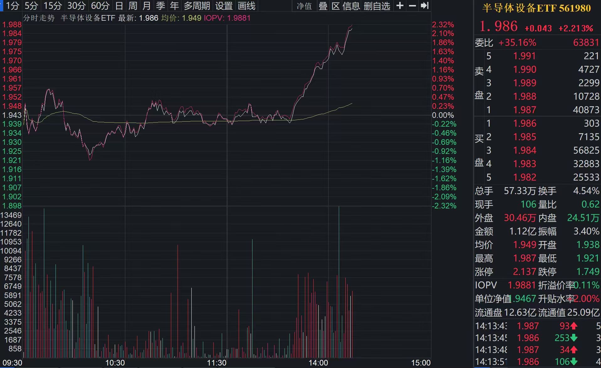 12月17日午后,半导体产业链多股反弹,上游设备强势拉升。热门$半导体设备ETF(SH561980)$ 盘中拉涨2.21%、实时成交额破1.1亿;成份股联动科技、海光信息大涨超5%,华峰测控、联动科技涨超4%,寒武纪、晶升股份、华海诚科涨超3%,芯源微、中芯国际等多股拉升。