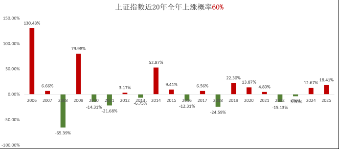 回归过去20年表现,2006-2025年间上证指数有12个完整年度录得正收益,全年上涨概率为60%。