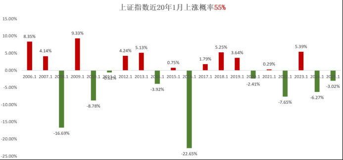 但时间维度缩短至1月来看,过去20年上证指数1月上涨概率下降到55%,赚钱难度有所增加。