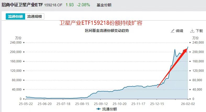 市场对卫星产业的长期战略价值正以真金白银持续投票。2月2日,作为板块核心指标的$卫星产业ETF(SZ159218)$ 韧性不减,当日获得资金净流入超2亿元。年初至今,该基金累计净流入规模已攀升至约27.2亿元,资金加速布局的趋势极为明显。