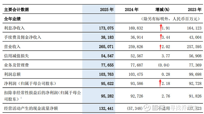 全年实现营业收入和净利润 2,651亿元、956亿元,同比分别增长 2.02%、2.18%, 利息净收入、中间业务收入同比均实现正增长。