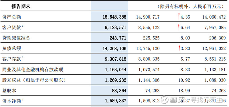 报告期末,集团资产总额 15.55 万亿元,较上年末增长 4.35%。其中客户贷款余额 9.12 万 亿元,较上年末增加 5,684.49 亿元,增幅 6.64%;客户存款余额 9.31 万亿元,较上年末增加 5,074.80 亿元,增幅 5.77%。