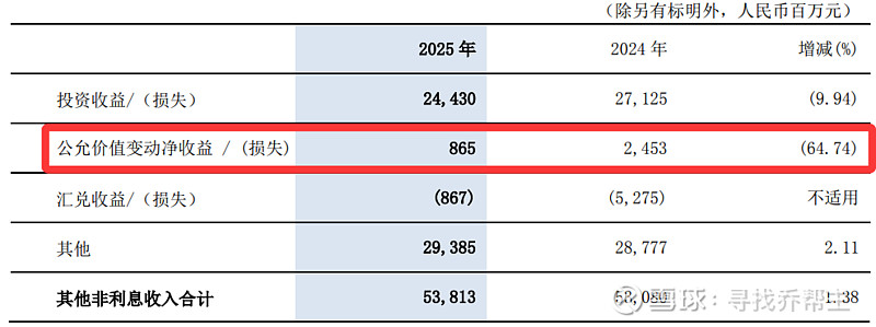 其他非利息收入 538.13 亿元,同比增加 7.33 亿元,其中投资收益 及公允价值变动净收益合计 252.95 亿元,同比减少 42.83 亿元,降幅 14.48%,主要是受市场 利率波动等因素影响,债券及利率衍生工具相关损益同比减少;汇兑及汇率产品净损失 8.67 亿 元,同比少损失 44.08 亿元,主要是掉期业务成本减少。