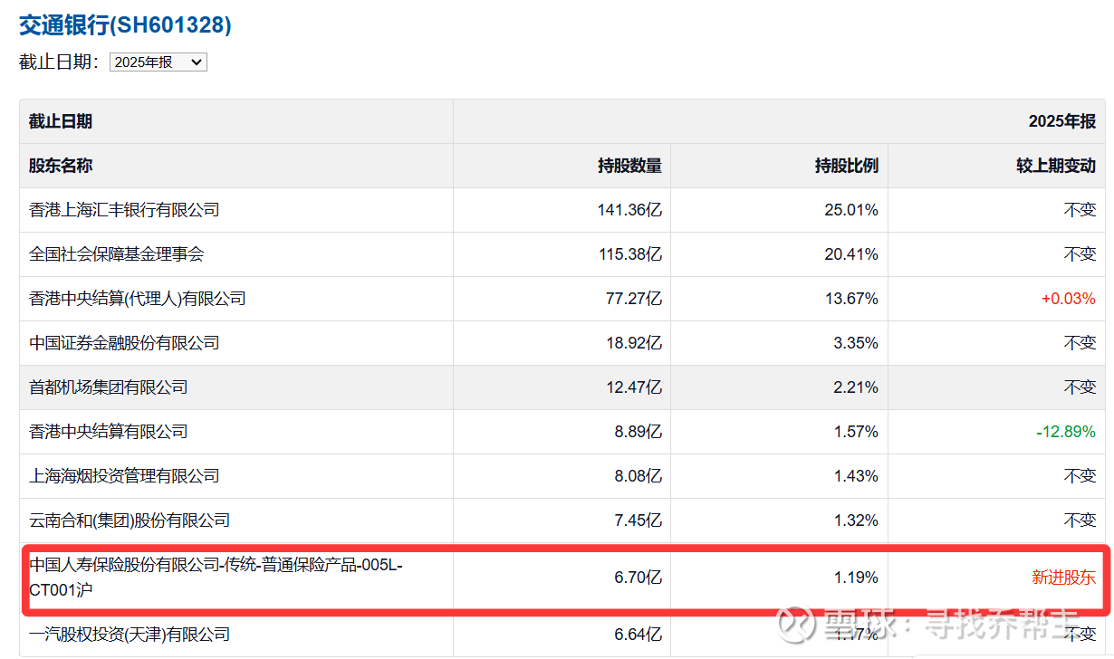 中国人寿保险股份有限公司四季度新进加仓交通银行6.7亿股。