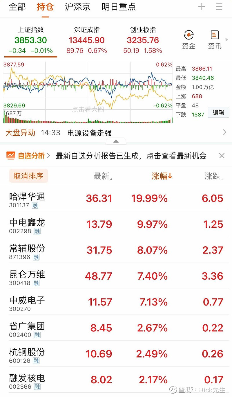 $中电鑫龙(SZ002298)$鑫龙鑫龙,算力新龙,希望明天鑫龙继续冲吧,今天又是靠着鑫龙回血的一天防守开盘整了核电,10 20 30各都买了点点,结果就哈焊靠谱。Ai软早盘很猛,又被骗进昆仑省广了大盘昨天普涨,今天个股普遍小回调,离国庆长假还剩3个交易日,能不能来点重磅,热热场子呀...