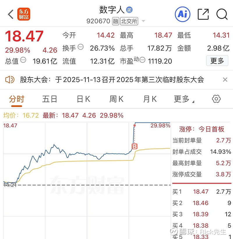 $数字人(BJ920670)$ $富士达(BJ920640)$ $天罡股份(BJ920651)$终于迎来北交盛世了,这两天被锦华山竹干沉默了,中午北交消息来了,下午就等着第一个上板的冲锋,数字人集合!!!上证4000了,北证也必须突破新高了!!!冲啊!!!