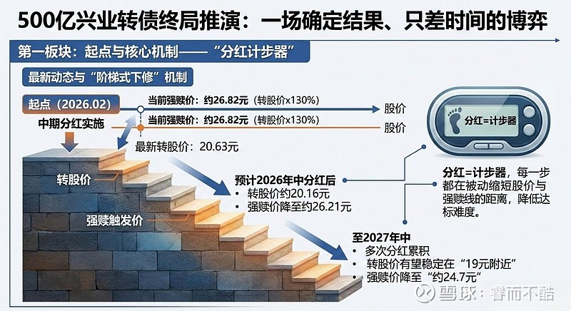 2. 开启“阶梯式下修”通道:这并非终点。根据分析,若2026年6月中下或7月中上实施年度分红(假设每股现金分红0.473元),转股价可能进一步下调至约20.16元,强赎价则同步降至约26.21元。当然,如果兴业银行今年6月或7月实施年度分红高于0.473元,那么强赎价则同步降至低于26.21元。到2027年6月或7月,经过最少3次分红累积,转股价可能稳定在19元附近,强赎价则降至约24.7元。这种通过持续分红“被动”下修转股价的路径,被形象地比喻为“计步器”,每一步都在缩短股价与强赎线之间的实际距离。