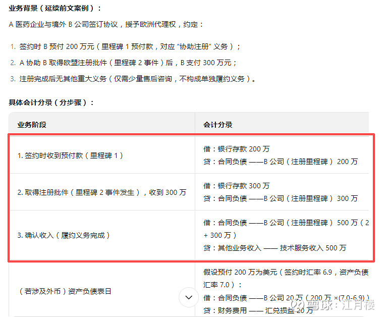 中国准则(CAS 14):强调 “企业因向客户转让商品而有权取得的对价很可能收回”,且需结合里程碑事件的 “实质性”(如是否代表代理权利的关键节点完成)。国际准则(IFRS 15):进一步明确 “里程碑款若与过去已完成的履约义务相关,且对价金额可可靠计量,则在里程碑事件发生时确认收入”。