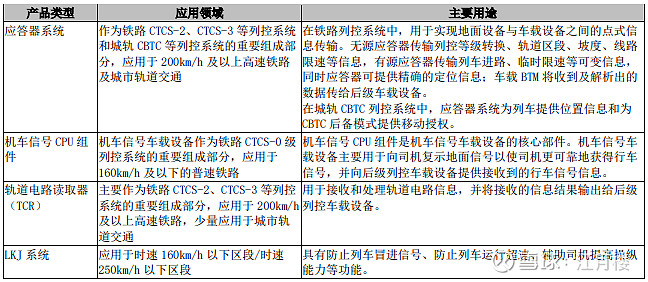 公司专注于应答器系统、机车信号车载设备和轨道电路读取器(TCR)等列控系统关 键设备的自主研发,研制的产品均实现了业界安全完整性等级中最高的安全等级 SIL4 级。 公司提供的主要产品为应答器系统、机车信号 CPU 组件、轨道电路读取器(TCR)和 LKJ 系统,广泛应用于城轨、普铁、高铁等领域。