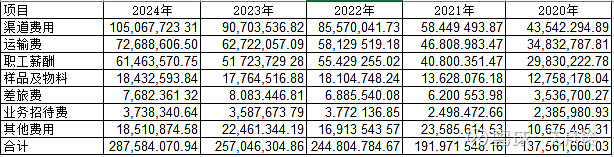 从2020年至2024年,几乎所有费用都翻了一倍。但销售额只从8.3亿增长至13.6亿。公司面临的压力就可见一般。