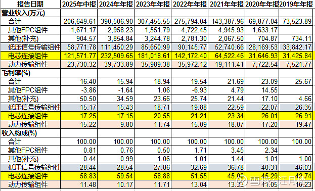 最主要的还是电芯连接组件,收入占比近60%,其中主要客户为宁德时代,毛利率相对控制在15-20%之间,属于正常水平;其次是低压信号传输租金啊,收入占比近30%,毛利率会比电芯略低;再次是动力传输组件,收入占比10%出头,其毛利也在15%左右;因为其下游基本上话语权很强,且基本属于完全竞争状态,不会给予太高的毛利率。