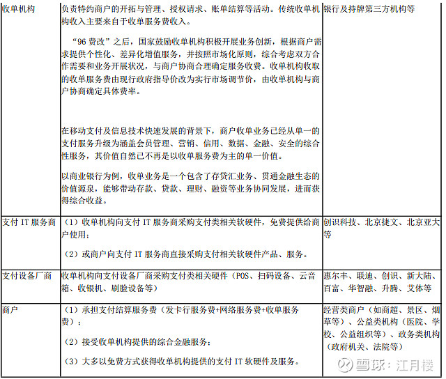 通过半年报,了解一下这个行业产业链上整体情况:公司是一家行业数字化方案商,其支付业务处于商户收单业务产业链。商户收单业务产业链上下游的主要参与者为发卡机构、银行卡清算机构、收单机构、支付 IT 服务商、支付设备厂商、商户,各机构分工差异如下: