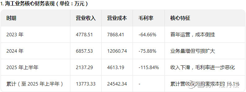 核心业务为海上风电安装与运维,船舶具备自升降、自航及 DP - Z 动力系统,最大吊装能力覆盖 13.6MW 机型,2024 年完成 60 余台吊装运维任务。受海上风电补贴退坡、用海审批滞后、市场价格低迷等影响,业务持续亏损,毛利率逐年恶化,累计营收与购置成本差距大。