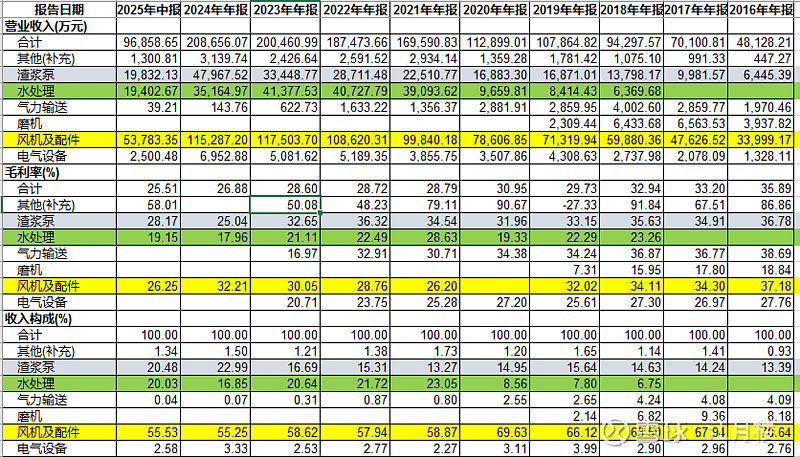 公司深耕风机领域 50 余年,已形成三大核心业务板块,2025 年上半年收入结构为风机 55.53%、渣浆泵 20.48%、水处理 20.03%、电气设备 2.58%、其他 1.37%。