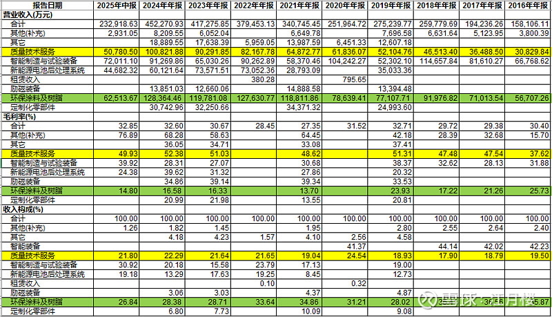 每年披露的口径不一致,因此我们整体归纳一下,质量技术服务的收入大数在10亿左右,毛利率50%,占收入的比重20%+;涂料的收入占比大概在30%,毛利率较低,不到20%;其他我们都归类到装备、系统类,整体收入占比近50%,毛利率大概在30%+。