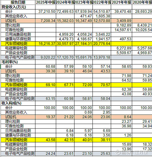 我们抓主要问题:收入的40%来自于汽车领域的检测,其毛利率约为70%;另外23-25%为电子电器产品检测,毛利率约为60%;另外试验机收入占比近20%,毛利率40%。整体毛利率接近60%。