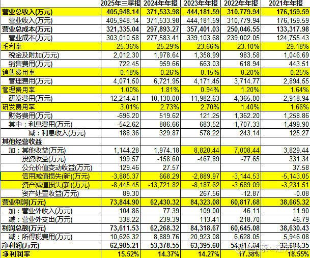 公司的单件产品价值量大,而且与下游客户深度绑定,因此公司虽采用直销模式,但销售费用总体小,不到营业收入的0.2%;管理费用率也持续偏低,仅占营收的1%;研发费用率大概在3%左右。