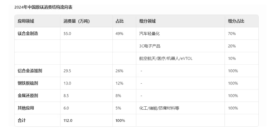 下图为2024年全球112万吨原镁流向,可见镁合金已成为主要应用领域,下游以汽车、3C、航空航天、军工和新兴科技行业为主。
