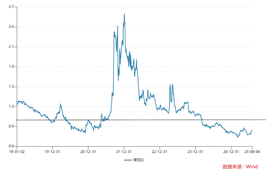 对照最新价格,截止8月10日,当前镁铝比处于0.8-0.9区间,处于历史最低位置,性价比凸显下应用场景大规模放量或提前。